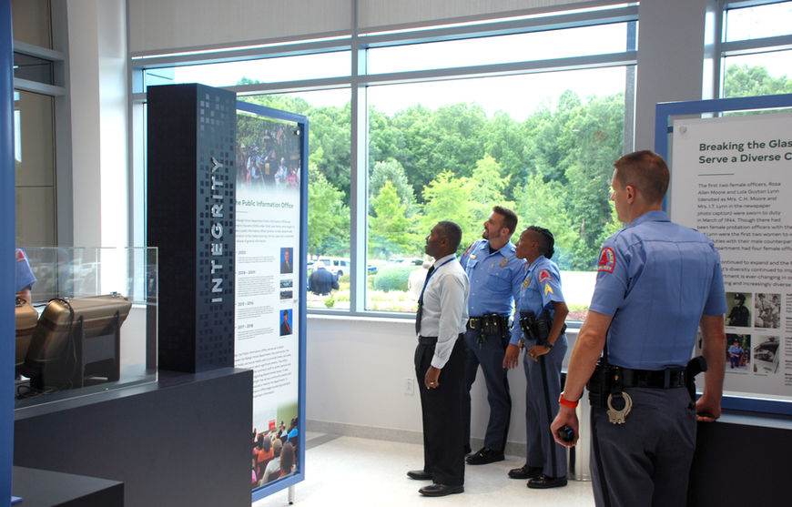 As a part of the new 60,000 sq/ft training center, Design Dimension was selected to partner with Moseley Architects to develop interpretive exhibits in the lobby to provide historical context to the Raleigh Police department. Our team worked with the RPD historian and public information officers to share stories of the past and the goals for the future of the department and it’s training academy. The narrative is organized by the five values, displayed as pillars in the exhibit: Service, Courage, Fairness, Integrity, and Compassion.
